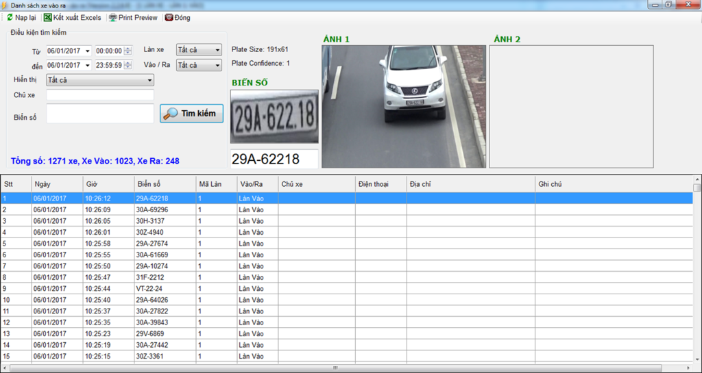 Giao diện phần mềm kiểm soát 1 làn xe – 2 camera nhận dạng biển số
